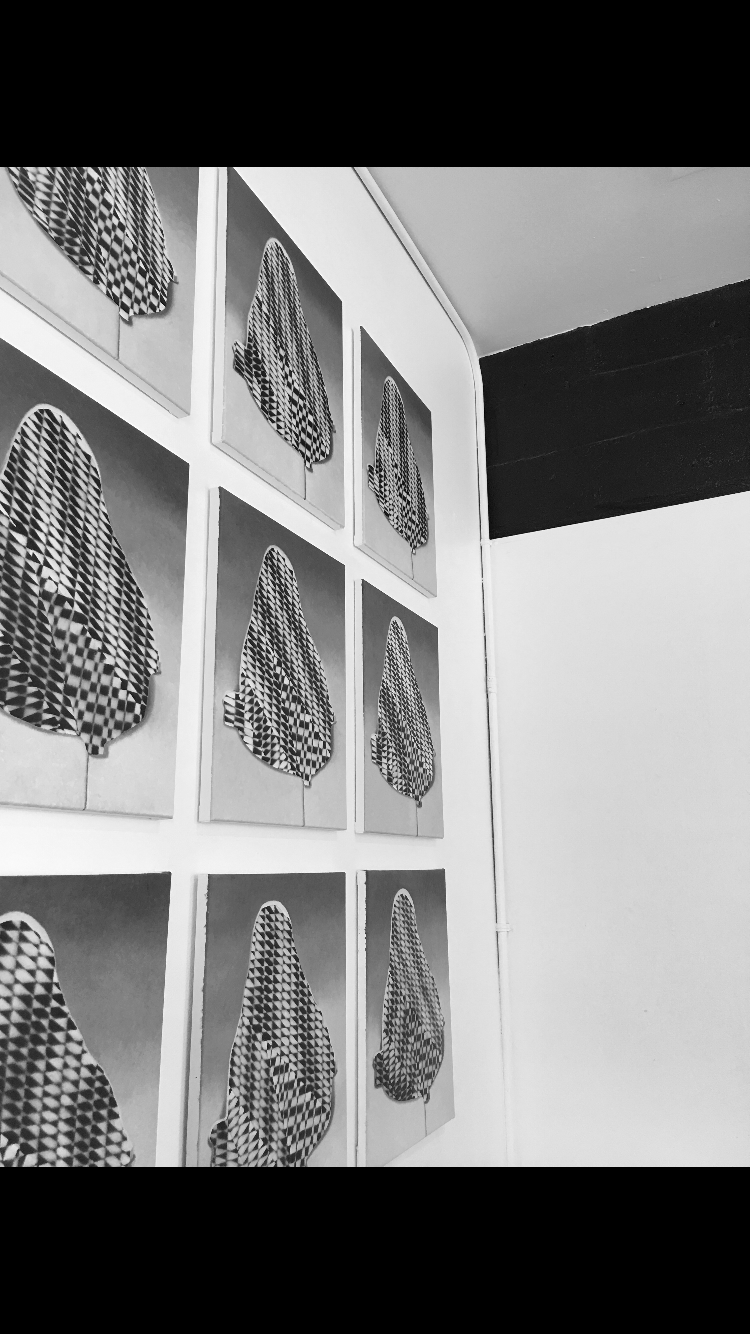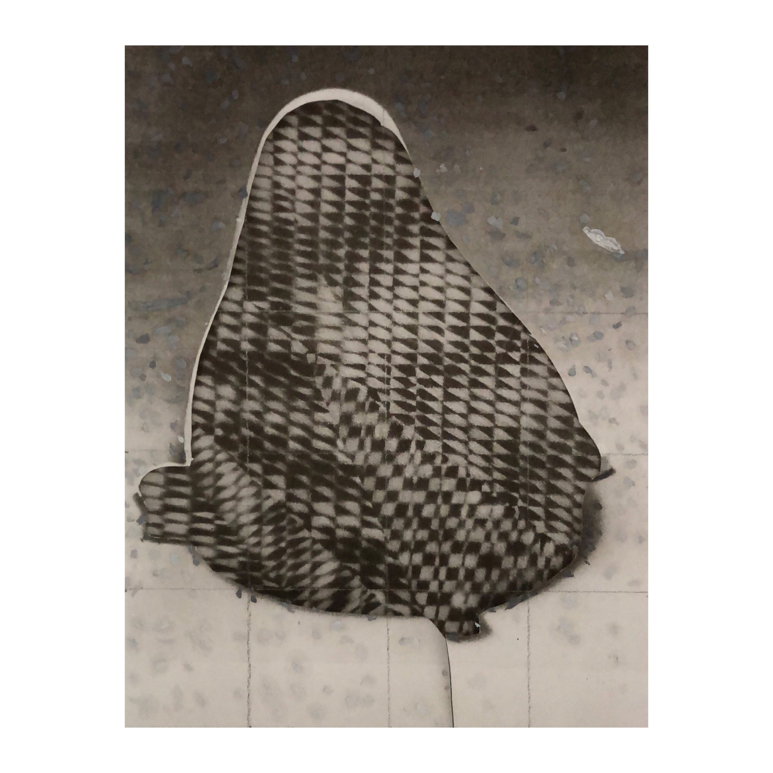 Along with the envelope painting are two 4-part groupings of painted drop ceiling tiles mounted on wooden shelves. Completed in 2020, the ceiling tiles are a material most commonly used to hide the inner workings of a residence or institution through an aesthetic of compartmentalization. The use of these objects furthered a preoccupation into spatial content-mainly borders, walls, and facades. Purpose built to hide the unseemly, I was fascinated by the idea of that which hides in plain sight. This idea of camouflage as a way beyond form and into resistance and liberation. A facade of disruption to the eye which patterns its survival on what is already seen.